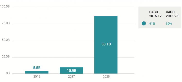 From now until 2025, the report predicts ecommerce to see the largest growth of any sector, expanding by around eight times its current value to hit US$88.1 billion.