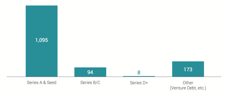 While that has been a boon for early-stage startups, it appears to have become tougher to secure growth-stage funding for those companies making the next step. Series B and C deals “dropped drastically,” with 94 recorded over the studied timeframe. Eight deals at series D and above were tracked.